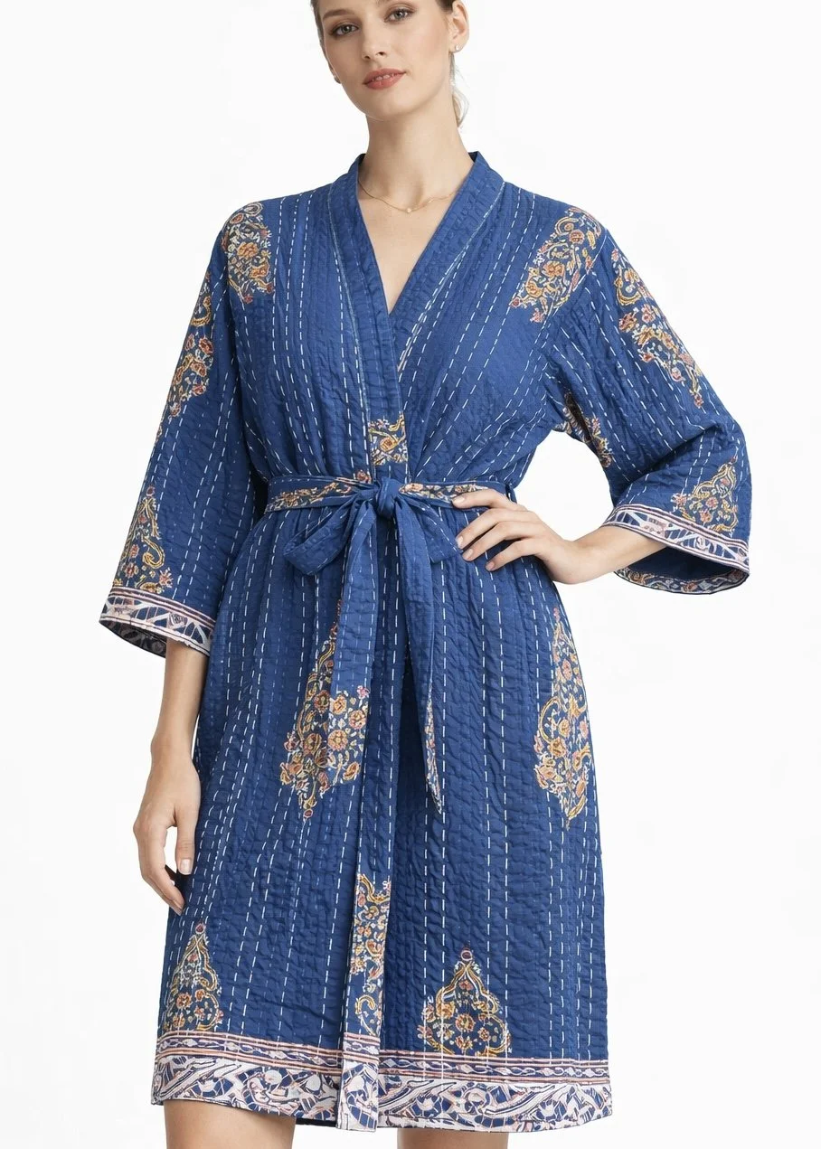 Kantha kimonoene er laget av 100% indisk bomull. La deg omfavnes av mykt stoff og varme - kimonoen er som en ordentlig god klem! Perfekt som morgenkåpe, eller som en jakke! Pyntes enkelt opp eller ned.