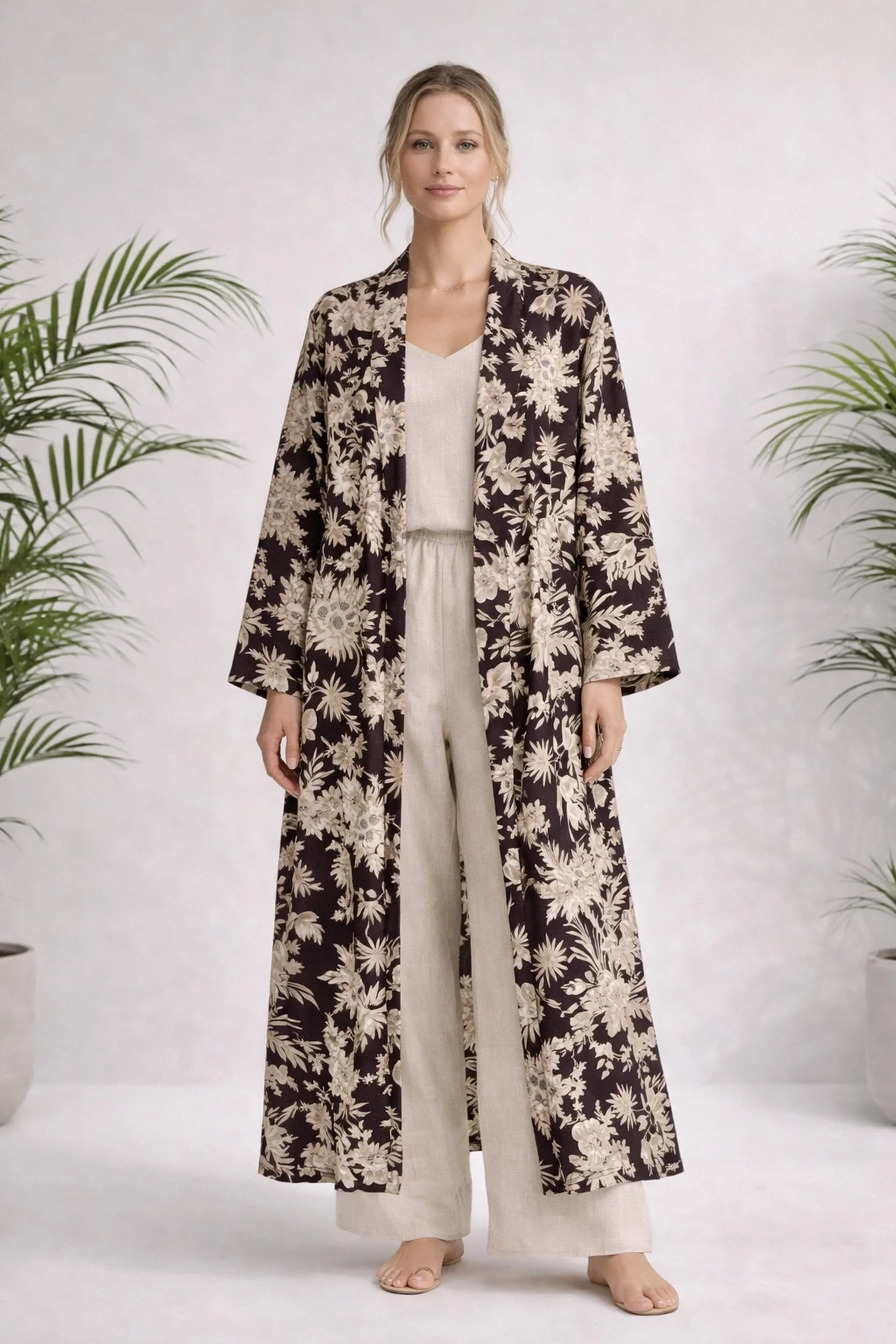 Kimono i bomull med nydelige farger og delikat mønster av blader og blomster. Du vil føle deg som en prinsesse!