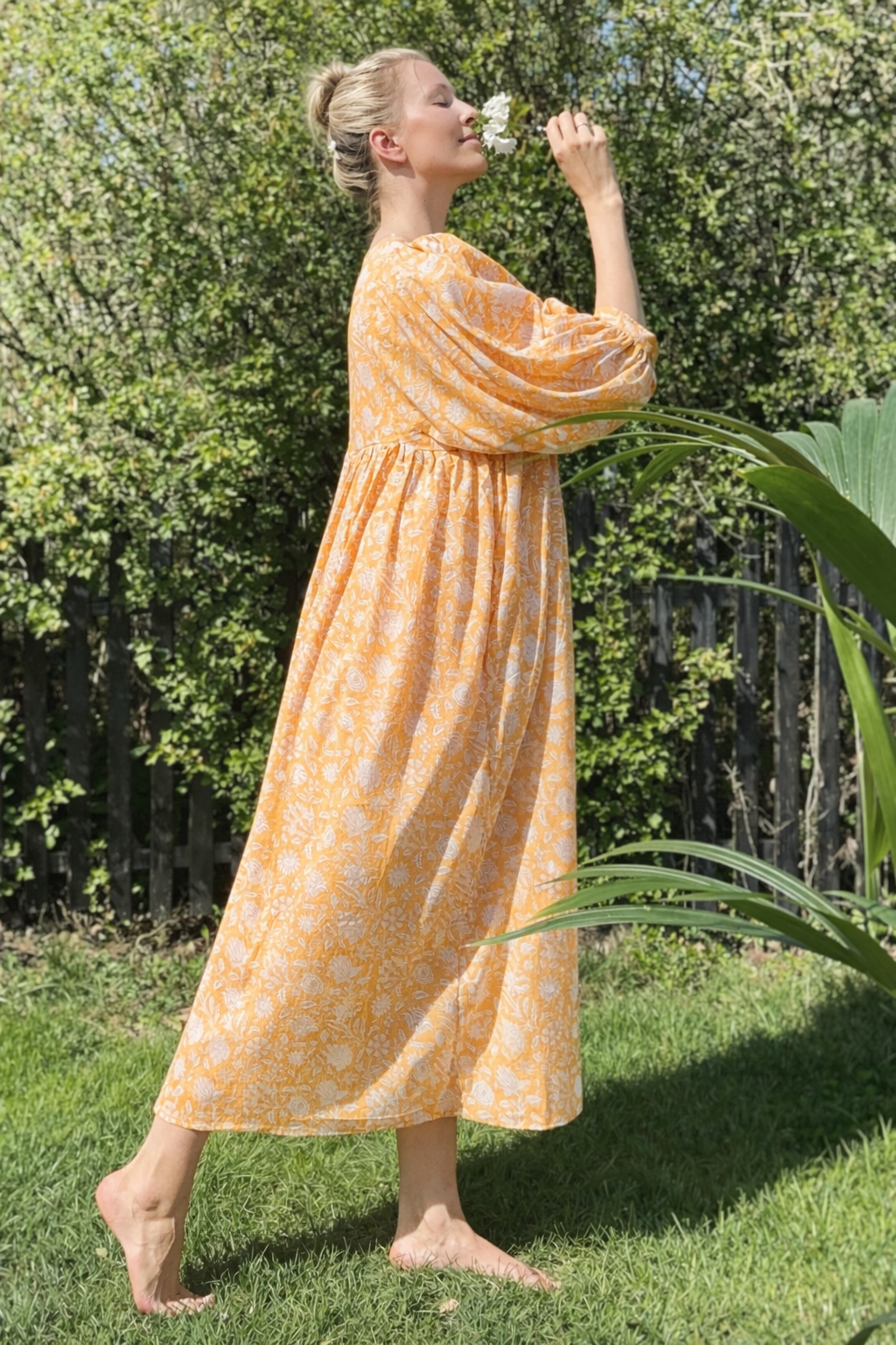 Dette er verdens beste kjole! Utrolig vakker og komfortabel kjole med puffermer i 100% indisk bomull. Nydelige farger og mønster, påført for hånd med tradisjonell blokktrykk teknikk. Fløyelsmykt og lett stoff, som faller flott rundt kroppen.