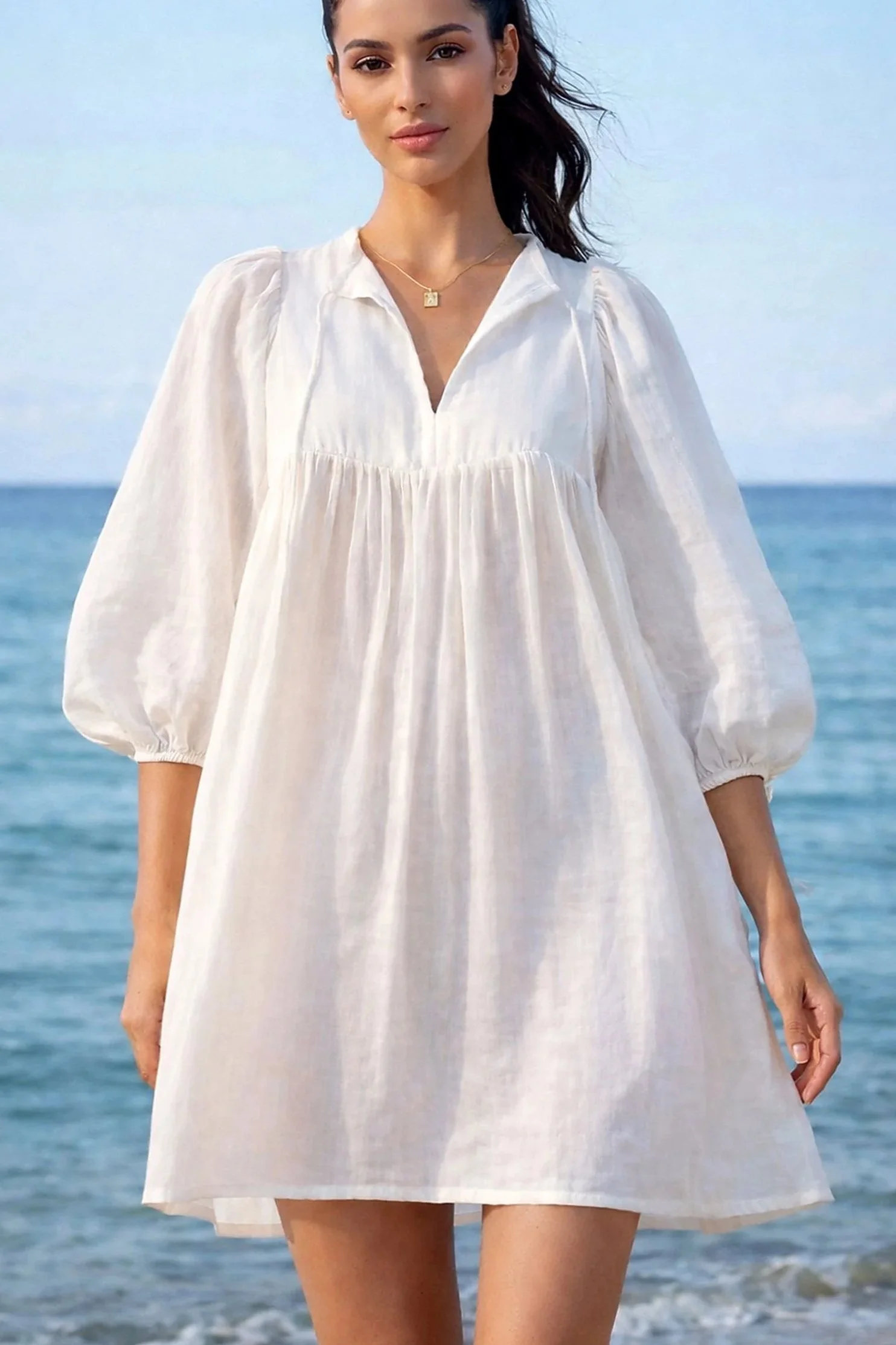 Kjole i bomull. Statement ballong/puff-ermer. Frontparti kan holdes åpent eller lukket.