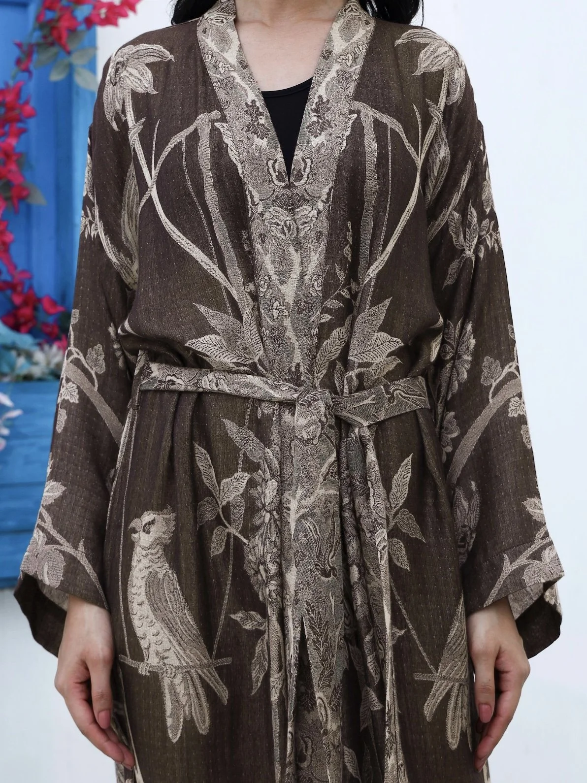 Kan brukes både inne og ute, til kos og til fest, hele året. Pyntes enkelt opp eller ned. Luksuriøs hjemmekos, etter et bad, ved bassenget, på bryllupsdagen eller andre spesielle anledninger. Bruk den gjerne åpen eller lukket over bukse eller kjole! Mange lager en enkel knute bak på ryggen med beltet når den brukes åpen for ekstra innsving.